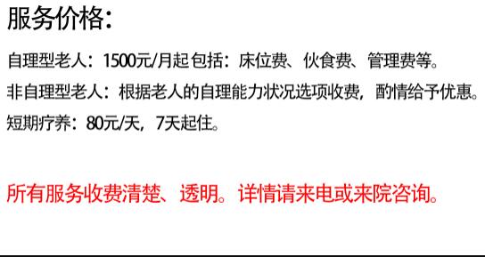收费合理透明,服务客观实用。 将努力创建“老人满意、家属放心、社会认可”的养老公寓,用 的“爱心、细心、耐心、责任心”为老人服务;用“尊老、爱老、敬老”的理念建立和谐的社会氛围。 热忱欢迎社会各界人士来电参观。